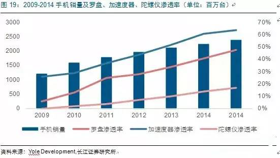 截至到2014年,常見的三種用于智能手機(jī)的羅盤傳感器、加速度器傳感器、陀螺儀滲透率分別為48%、64%、17%,陀螺儀滲透率偏低,通常在高端機(jī)型上有配置。