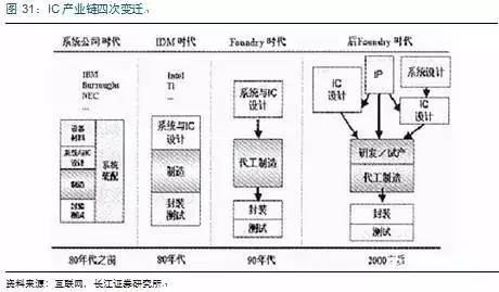 在集成電路產(chǎn)業(yè)飛速發(fā)展的背后,IC設(shè)計(jì)和制造方式一直在進(jìn)行調(diào)整,產(chǎn)業(yè)鏈條不斷裂變。自上個(gè)世紀(jì)80年代以來IC產(chǎn)業(yè)經(jīng)歷了四個(gè)階段,代工模式(Foundry)的出現(xiàn)是導(dǎo)致IC產(chǎn)業(yè)鏈條裂變的一個(gè)重要因素。這以上世紀(jì)90年代臺(tái)灣集成電路公司(TSMC)等代工企業(yè)的興起為標(biāo)志,典型特征是晶圓代工企業(yè)與IC設(shè)計(jì)公司相互分離,新興的IC設(shè)計(jì)公司(Fabless,即無工廠化)不再擁有自己的生產(chǎn)線,這種產(chǎn)業(yè)模式因其快速靈活、適應(yīng)市場(chǎng)需要迅速成長(zhǎng)起來。