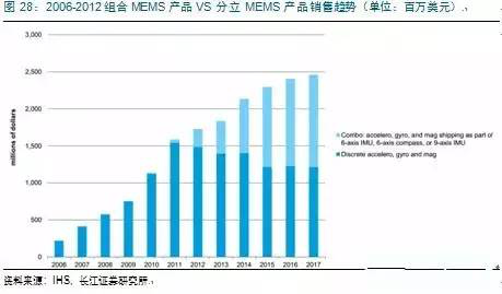 根據(jù)HIS的數(shù)據(jù),組合傳感器市場(chǎng)在2011年之后占比逐步上升,預(yù)計(jì)到2017年一半的MEMS產(chǎn)品是組合形式。慣性傳感器的價(jià)值已經(jīng)嚴(yán)重下滑,從分立傳感器轉(zhuǎn)向組合傳感器,三軸分立傳感器,甚至六軸組合傳感器的價(jià)格已經(jīng)非常低了,集成三軸陀螺儀,三軸加速傳感器,三軸磁感應(yīng)傳感器的九軸慣性傳感器將有明顯優(yōu)勢(shì)。