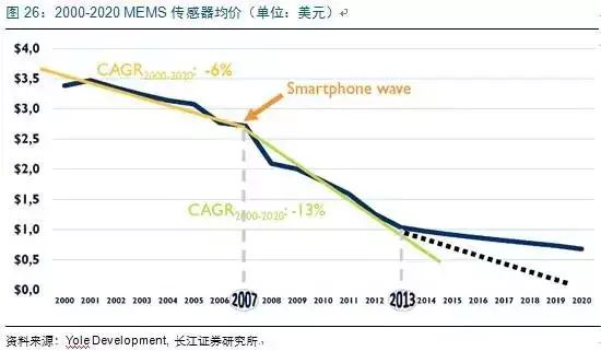 2001-2007年間,MEMS傳感器均價(jià)由3.5美元降低到接近2.7美元,CAGR為-6%;2007-2013年間,MEMS傳感器均價(jià)由接近2.7美元降低到1美元,CAGR為-13%。過去五年MEMS市場(chǎng)參與者不斷增加,尤其移動(dòng)端貨量急劇增長(zhǎng),給價(jià)格帶來了較大的壓力,市場(chǎng)有內(nèi)在出清的需求。