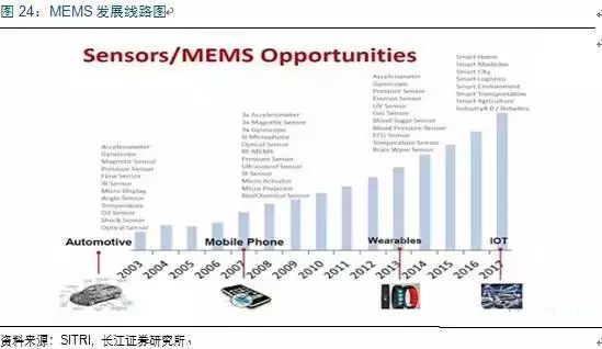 MEMS的傳感器發(fā)展共經(jīng)歷了三個(gè)階段,分別對(duì)應(yīng)不同的驅(qū)動(dòng)力。2000年左右是汽車電子、2007年左右是智能手機(jī)、2013年左右是可穿戴設(shè)備,下一個(gè)驅(qū)動(dòng)MEMS的傳感器發(fā)展的動(dòng)力是物聯(lián)網(wǎng),業(yè)界預(yù)測(cè)全球傳感器需求有望從當(dāng)前的百億級(jí)激增到2025年的Trillion-Sensor(TSensor,萬億-傳感器)量級(jí)。
