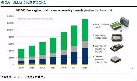 MEMS主要的封裝技術(shù)為BGA/LGA和 WLP,近年來WLP份額增長(zhǎng)較快,2016年幾乎與BGA/LGA持平,是MEMS領(lǐng)域最有潛力的封裝技術(shù)。