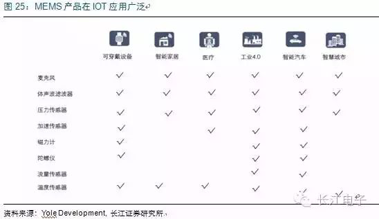 MEMS技術(shù)在可穿戴設(shè)備、智能家居、醫(yī)療、工業(yè)4.0、智能汽車、智慧城市等IOT細(xì)分領(lǐng)域都有廣泛的應(yīng)用,常見的MEMS傳感器諸如麥克風(fēng)、體聲波濾波器、壓力傳感器、溫度傳感器等都存在豐富的應(yīng)用場(chǎng)景。