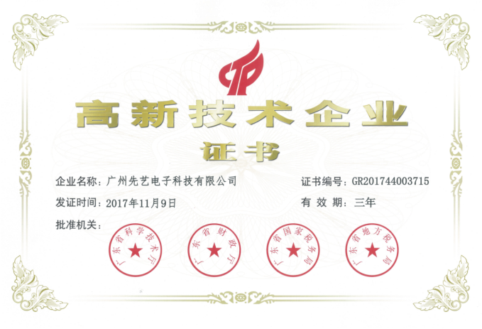 2017年,廣州先藝電子科技有限公司順利完成高新技術企業(yè)復審工作,獲得“高新技術企業(yè)”證書。