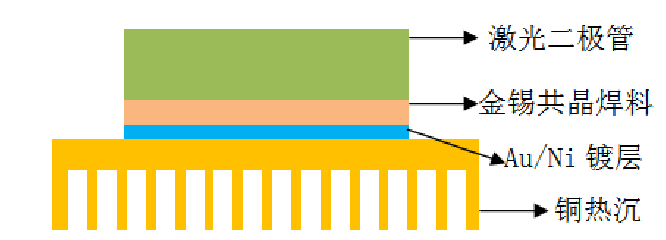 激光加工的普及使得功率激光二極管的應(yīng)用越來越廣泛。隨著封裝技術(shù)和芯片技術(shù)的提高,功率激光二極管的功率越來越高,隨之而產(chǎn)生的熱量達(dá)到了驚人的密度。由于激光二極管的發(fā)光效率會隨溫度升高而下降,因此激光二極管工作時(shí)的散熱顯得極為重要。采用金錫共晶合金焊料封裝就可很好地解決散熱問題。將激光二極管芯片通過預(yù)成型金錫焊料直接焊接到銅熱沉上,不僅大大提高了導(dǎo)熱能力,同時(shí)還有較高的強(qiáng)度和較好的抗熱疲勞特性。芯片底部覆金與鍍金的熱沉封裝面可以直接用金錫合金焊接而不需要制備過渡層金屬,如圖7所示。另外,因?yàn)榻疱a合金的楊氏模量高,即使在很薄的情況下(5-25μm),也可以保持平整性和一定的抗彎性,因此在焊接過程中焊層夾雜氣孔的可能性大大降低,提高了激光二極管散熱性能和可靠性。