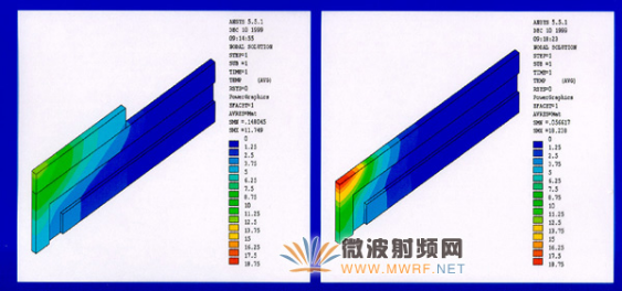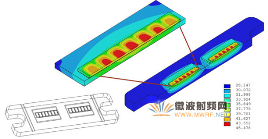 圖5. (a) 在接合到CuW 法蘭的BeO 散熱片上集成分立式射頻器件的射頻封裝模擬。