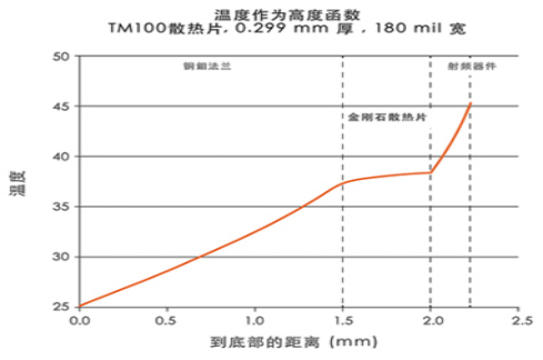 另一示例是由分立式射頻器件組成的射頻封裝,這些射頻器件連接到CuW法蘭上安裝的1 mm厚氧化鈹散熱片上。氧化鈹有毒且熱導(dǎo)率僅約為200 Wmˉ?Kˉ?。熱學(xué)模型(圖5)表明用300 μm 厚的TM100 CVD 金剛石替代氧化鈹可使熱阻下降30%。由紅外攝像頭采集的整個封裝溫度下降測量結(jié)果顯示了整個器件和CuW 法蘭溫度下降最大值,同時也顯示了金剛石層溫度下降幾乎可忽略。目前該產(chǎn)品已大批量生產(chǎn),借助CVD金剛石使相同結(jié)溫下輸出提高40%。