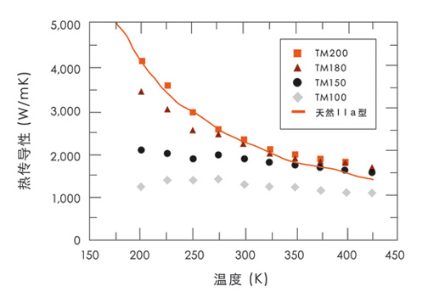 高級產(chǎn)品在低于室溫條件下的熱性能更具優(yōu)勢,溫度低至100°K時熱導(dǎo)率顯著提高。圖2中TM180 和TM200 等級顯示的性能與溫度變化趨勢與IIa 型天然金剛石類似。