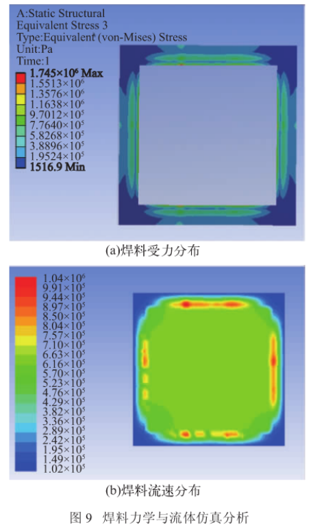 扇形空洞在大尺寸電路中較為常見,其形成原因主要是:在施加封蓋壓力時,夾具往往作用在蓋板中心區(qū)域,其下方正是管殼的空腔,這會導(dǎo)致蓋板發(fā)生輕微變形。大尺寸電路封蓋時所需施加的焊接壓力也較大,其變形程度也較大,這使得蓋板在轉(zhuǎn)角處翹曲,導(dǎo)致 4 個轉(zhuǎn)角處蓋板與管殼之間的距離要比 4 個邊及中間區(qū)域大。這導(dǎo)致焊接壓力在焊料上的不均勻分布,如圖 9(a)所示。在焊接壓力不足的情況下,轉(zhuǎn)角處焊料流速降低,呈現(xiàn)縱向堆積,如圖 9(b)所示。這樣一來,填滿同樣大小的面積轉(zhuǎn)角處就需要更多的焊料量。但轉(zhuǎn)角區(qū)域的焊料是有限的,焊料缺少的部分就形成了大量空洞。另一種形成扇形空洞的原因是原材料造成的密封壓力不均勻,早期的陶瓷外殼制備工藝不成熟,金屬化密封區(qū)的狀態(tài)差,表現(xiàn)為陶瓷基體的平面度較差,這樣即使提供了相對均勻的密封壓力,作用在平面度較差的密封區(qū)后也會形成焊接壓力不均勻的狀況,導(dǎo)致扇形空洞。