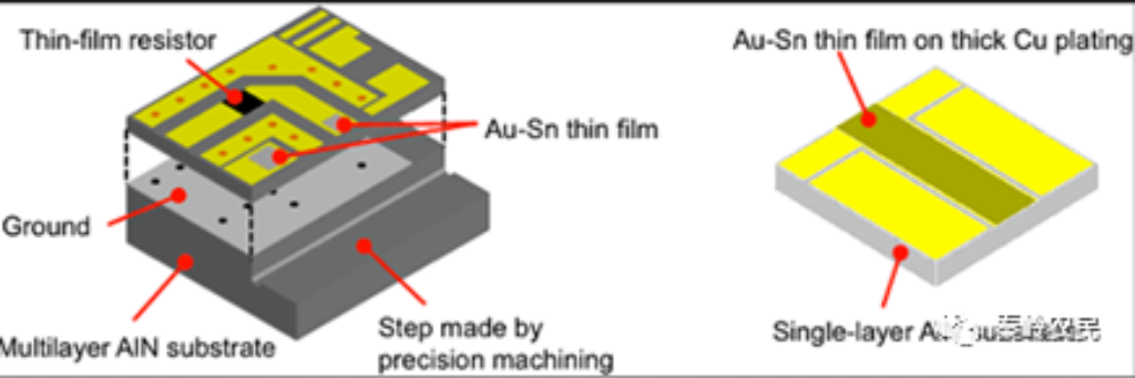 對一些高功率或者氣密封裝芯片一般需要將芯片焊接在基板上。在這種情況下,主要考慮焊料的重新填充和焊料的高導(dǎo)熱性能。另外金錫合金的楊氏模量高,即使在很?。?~25um)情況下,也可以保證憑證行和穩(wěn)定的抗彎性。增加了芯片焊接的可靠性。在一些需要控制溫度恒定的器件,如高速通信激光器件,其焊接激光器芯片所需要用到的也是金錫,焊接過程中焊層內(nèi)沒有氣孔降低了焊接點的熱阻。從而提高了導(dǎo)熱性能。
