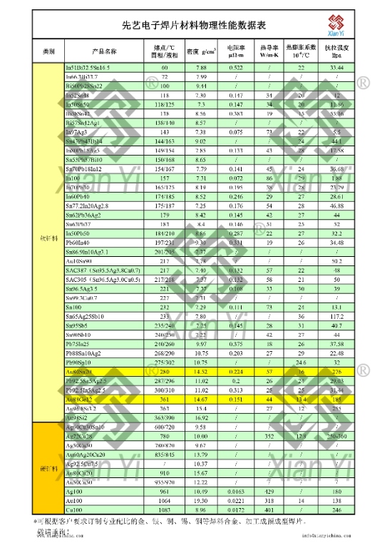 先藝電子提供液相線從60℃到1083℃不等的焊料合金以匹配不同應(yīng)用溫度需求,合金種類多樣,包括金基合金、銦基合金、有鉛合金、無鉛合金、硬釬料合金、軟釬料合金等??筛鶕?jù)客戶要求訂制專業(yè)配比的金、銀、銅、錫、銦等焊料合金、加工成預成形焊片。