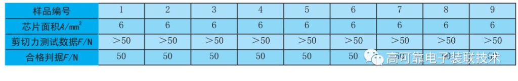 利用推拉力測試儀對試驗的9個樣品剪切強(qiáng)度進(jìn)行測試,測試結(jié)果見表4。由于Dage400只配備了50 N的推頭,量程為50 N,所有樣品均未出現(xiàn)脫離,可得知所有樣品剪切強(qiáng)度大于50 N,滿足GJB548B的要求。
