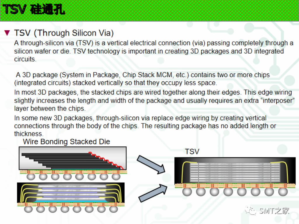 半導(dǎo)體產(chǎn)品在由二維向三維發(fā)展,從技術(shù)發(fā)展方向半導(dǎo)體產(chǎn)品出現(xiàn)了系統(tǒng)級(jí)封裝(SiP)等新的封裝方式,從技術(shù)實(shí)現(xiàn)方法出現(xiàn)了倒裝(FlipChip),凸塊(Bumping),晶圓級(jí)封裝(Wafer level package),2.5D封裝(interposer,RDL等),3D封裝(TSV)等先進(jìn)封裝技術(shù)。