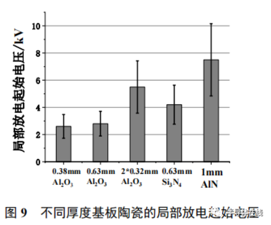 4) 使用基板堆疊,即將一個 DBC 基板疊加在另一個 DBC 基板之上,不僅增加了總絕緣厚度,也可以將中間電位鉗制住,從而大大減小陶瓷內和三結合點處的電場強度。局部放電測試結果顯示(如圖 9),與單個 0.63 mm 的基板相比,通過堆疊兩個 0.32 mm 的 Al2O3 陶瓷基板,局部放電起始電壓提高 94%。但進一步增加堆疊層數對抑制局部放電的效果不是十分顯著,比如采用三層陶瓷基板疊加時,相比兩層陶瓷基板疊加,局部放電起始電壓只增加了 15%。此外,如果基板疊層的中間金屬層保持浮動,則電場減弱效應將大打折扣。