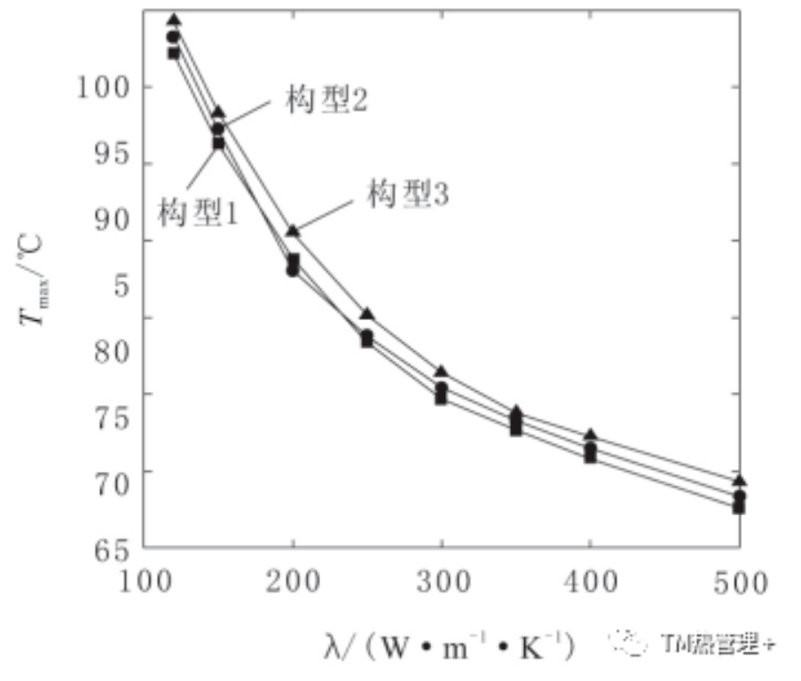 圖3給出了h=2.15mm,不同冷板構(gòu)型條件 下,芯片殼溫隨 T/R 殼體材料導(dǎo)熱系數(shù)的變化規(guī)律,由圖可知,在常用冷板翅片規(guī)格的條件下,冷板構(gòu)型對(duì)散熱影響較小。