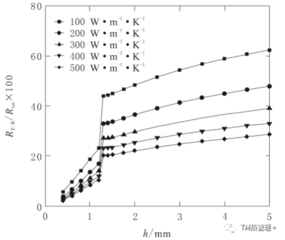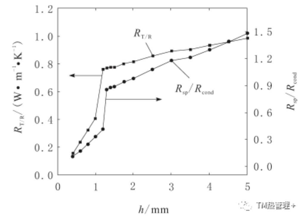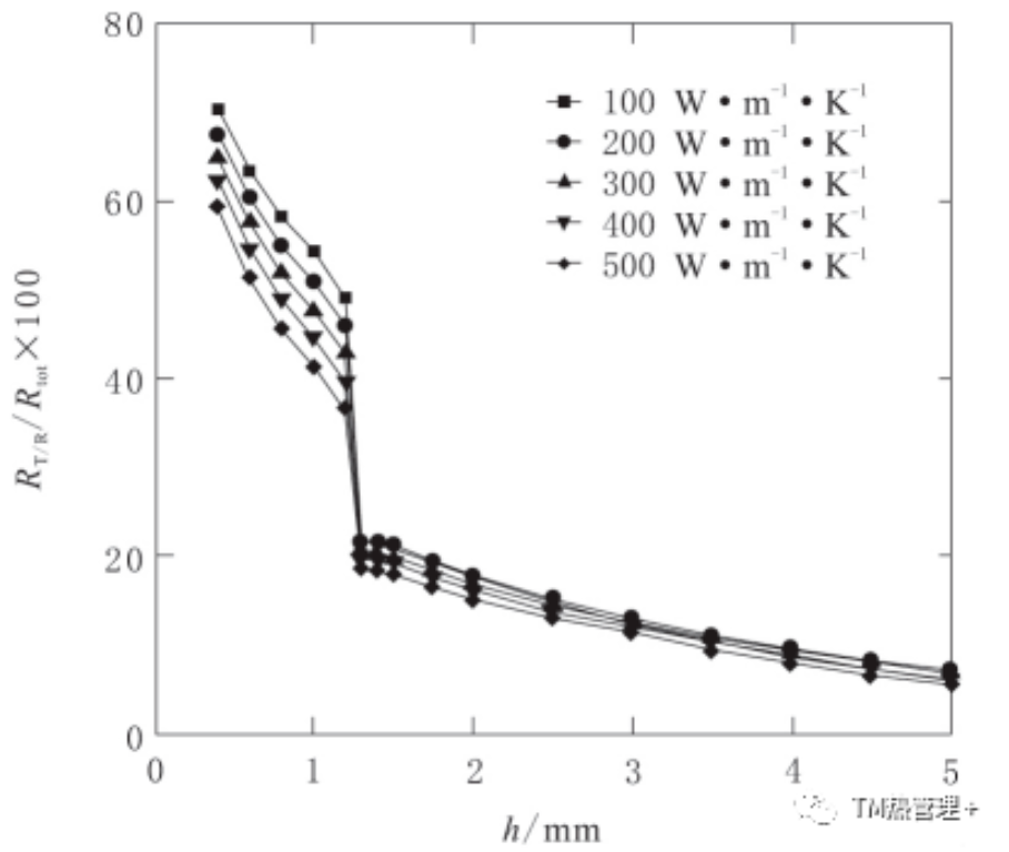 圖6給出了圖4對(duì)應(yīng)工況下,T/R 組件殼體熱 阻RT/R,T/R擴(kuò)展熱阻 Rsp與傳導(dǎo)熱阻(Rcond)隨厚度h的變化關(guān)系。由圖6可知,當(dāng) T/R 殼體厚度h約大于1.5mm 時(shí),隨著厚度h的增加,擴(kuò)展熱阻有明顯增大,擴(kuò)展熱阻 Rsp 在 T/R 殼體傳熱過程中的逐漸起主導(dǎo)作用。此時(shí),盡管RT/R隨著 T/R殼體厚度的增加而增加,但擴(kuò)展散熱能力卻隨著厚度的增加而逐漸增強(qiáng),熱量向冷端傳遞的同時(shí),也向周邊擴(kuò)散,使得熱流密度向冷端傳遞過程中迅速衰減。 換句話說,隨著厚度增加,增大了芯片傳熱過程中的散熱通道,使得總熱阻也快速減小。因此,當(dāng)h>1.5mm 時(shí),提高 T/R殼體材料導(dǎo)熱系數(shù),可推測(cè)將大幅降低芯片傳熱路徑熱阻。