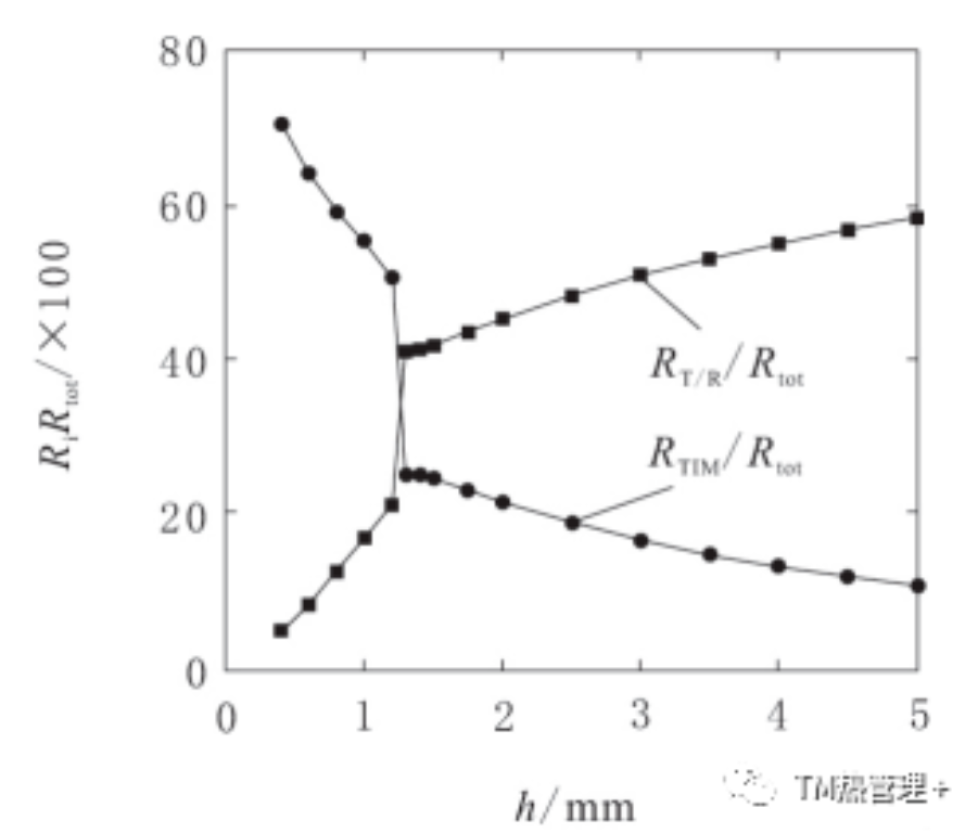 圖4給出了λ=120W·m-1·K-1,冷板翅片為構(gòu)型2,芯 片 傳 熱 總 熱 阻 (Rtot)、T/R殼 體 熱 阻 (RT/R)和界面接觸熱阻(RTIM )隨T/R 殼體厚度變化規(guī)律。由圖4可知,隨著 T/R 殼 體厚度的增加, 總熱阻Rtot逐漸減小。當(dāng)T/R組件殼體厚度h<1.0mm 時(shí),界面接觸熱阻 RTIM 遠(yuǎn)大于T/R殼體熱阻 RT/R,此時(shí),熱界面層是整個(gè)傳熱過程中熱阻礙的關(guān)鍵環(huán)節(jié);當(dāng) T/R組件殼體厚度介于1.0~1.5mm時(shí), 熱阻有較大的階躍變化;當(dāng) T/R 組件殼體厚度h>1.5mm時(shí),T/R 殼體厚度對(duì)熱阻的變化影響較小。 圖5給出了 T/R殼體熱阻RT/R、界面接觸熱阻RTIM占總熱阻的比例變化。由圖5可知,當(dāng)h>1.5mm 時(shí),T/R 殼體熱阻 RT/R約占總熱阻的40%~60%, 而界面接觸熱阻 RTIM 占總熱阻的比例卻由約25% 逐漸降低到10%左 右,表明此時(shí) T/R 殼體熱阻是整個(gè)傳熱過程中的關(guān)鍵環(huán)節(jié)。