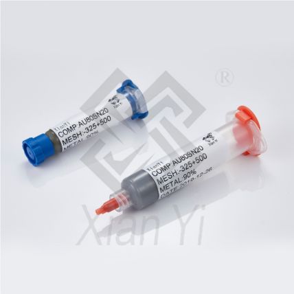 金錫焊膏作為一種高可靠性高溫焊膏,可用于服役溫度范圍較高(超過150℃)的場(chǎng)合,具有熱疲勞性能好、在高溫下強(qiáng)度高、抗腐蝕與抗氧化性能優(yōu)異的特點(diǎn)。還可用于階梯回流焊接過程中的第一級(jí)回流焊接,避免在后續(xù)低溫回流過程中的焊點(diǎn)熔化。相較于金錫預(yù)成型焊片,金錫焊膏在使用方式上更加靈活多樣,非常適合應(yīng)用于微型光電器件的高可靠性封裝及大功率器件的高導(dǎo)熱封裝。