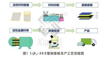 目前,Si3N4-AMB覆銅基板商業(yè)化生產(chǎn)的核心工藝幾乎被美國Rogers、德國Heraeus和日本Ferrotec等幾家國際大公司所壟斷,國內(nèi)還尚未實現(xiàn)這一領(lǐng)域的商業(yè)化生產(chǎn),僅僅開展了一些基礎(chǔ)的研究工作,積累了一定的經(jīng)驗。據(jù)公開資料顯示,Si3N4-AMB覆銅基板的基本工藝流程如圖1所示,其中活性釬料的制備與活性金屬釬焊是目前的重點和難點。