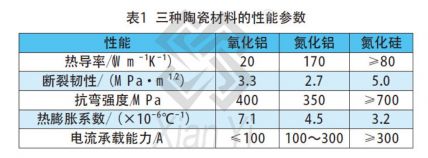 表1列出了三種常用陶瓷基板的主要性能參數(shù)。首先,熱導率是封裝基板最為重要的性能參數(shù)之一。目前商用氮化硅陶瓷板的熱導率基本在80~90 Wm-1K-1之間,其導熱能力不如氮化鋁陶瓷,但余曉初等人在文獻[21]中指出,傳熱學中材料的熱阻通常表示為: