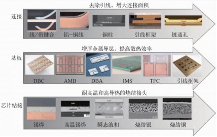 芯片粘接、連接和基板等關(guān)鍵封裝材料與技術(shù)的發(fā)展趨勢(shì)如圖2所示。連接技術(shù)從鍵合引線向帶狀、銅柱、引線框架和電鍍通孔等方向發(fā)展,通過去除引線、增大連接面積來提高導(dǎo)熱和導(dǎo)電性能。芯片粘接材料從傳統(tǒng)錫焊向金基高溫釬焊、瞬態(tài)液相連接、燒結(jié)銀和燒結(jié)銅等方向發(fā)展,大幅提高導(dǎo)熱和導(dǎo)電性能,滿足高溫可靠應(yīng)用?;逑蛑龊裉沾苫宓慕饘賹?dǎo)電導(dǎo)熱層發(fā)展,從而提高散熱效率[5]。