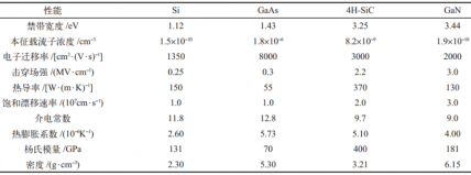 常用半導(dǎo)體材料的性能參數(shù)如表1所示[6-7]。Si因?yàn)榧夹g(shù)成熟和成本低等特點(diǎn),目前被廣泛應(yīng)用在各類分立器件和集成電路、電子信息網(wǎng)絡(luò)工程等領(lǐng)域。相比于Si,GaAs具備禁帶寬度大、電子遷移率高的特性,能顯著減小射頻尺寸、降低功耗,在射頻、無線通信和光電子領(lǐng)域的中低功率器件方面得到廣泛應(yīng)用。SiC和GaN具有更大的禁帶寬度,在高溫工作時(shí)不易吸收熱輻射能量跳變到導(dǎo)帶,并且具有更高的擊穿場(chǎng)強(qiáng),所以寬禁帶半導(dǎo)體SiC和GaN比Si更適用于高溫和高壓場(chǎng)合。SiC的熱導(dǎo)率更大,散熱能力更好,具有較高的載流子遷移率,能夠提供較高的電流密度,并且耐高溫、耐高壓,因此常被用做功率器件,在電壓600 V及以上的高功率領(lǐng)域具有顯著優(yōu)勢(shì),在新能源汽車和電力設(shè)備等領(lǐng)域應(yīng)用廣泛。GaN的電子遷移率和載流子速度更快,在高壓時(shí)的導(dǎo)通電阻和寄生參數(shù)更小,在高功率射頻方向具備明顯優(yōu)勢(shì)。因?yàn)镚aN具有高功率密度、低能耗、適合高頻率、支持更寬帶寬等特點(diǎn),主要用于5G通信和衛(wèi)星通訊等微波射頻領(lǐng)域、消費(fèi)電子快充和新能源汽車等電力電子領(lǐng)域以及LED光電子等領(lǐng)域。與SiC類似,目前GaN技術(shù)仍在快速發(fā)展階段,成本相對(duì)較高。