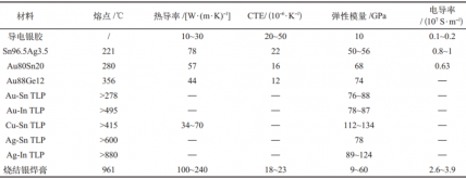 目前應(yīng)用最廣泛的芯片粘接材料如表2所示[8]。導(dǎo)電銀膠主要由樹脂基體、導(dǎo)電粒子(主要為銀粉)和分散添加劑、助劑等組成,其電導(dǎo)率和熱導(dǎo)率相對(duì)較低,玻璃化溫度約為100~150℃,在高溫、高壓芯片封裝領(lǐng)域受到限制。與SnPb釬料相比,無鉛釬料如SnAg或SnAgCu等,Sn含量一般高于90%,熔點(diǎn)相對(duì)較高(220 ℃左右),在凝固過程中過冷度較大,容易形成粗大的樹枝晶組織及金屬間化合物,并呈不均勻分布,使其抗蠕變性減弱。此外,SnAgCu合金有較高的彈性模量,CTE與芯片和基板相差較大,在熱循環(huán)載荷作用下易發(fā)生疲勞破壞導(dǎo)致焊點(diǎn)剝離,降低了焊點(diǎn)可靠性[9]。