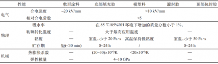 塑封材料的主要功能是電氣絕緣和環(huán)境隔離,起到防潮、防鹽霧、防霉、防塵、防碰撞和防振等防護(hù)作用,避免遭受環(huán)境的腐蝕與破壞,從而保證電子組件的電氣性能,甚至提高高壓功率模塊的電壓等級(jí),避免電極放電,最終提高電子產(chǎn)品的可靠性[14]。塑封材料的種類和性能如表3所示,塑封材料可分為敷形涂料(Conformal Coatings)、底部填充膠(Underfills)、模塑料(Molding Compounds)、灌封膠(Potting Compounds)和頂部包封膠(Glob Tops)[14]。