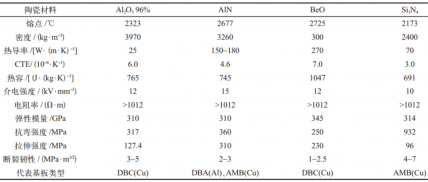 綜合考慮熱導(dǎo)率和CTE等,Al2O3、Si3N4、AlN和BeO是基板中最常用的陶瓷材料,其性能比較見表4[8,16]。BeO具有最高的熱導(dǎo)率,但是制備過程中的微塵對(duì)人體有害,導(dǎo)致其應(yīng)用受到很大限制。Al2O3是最經(jīng)濟(jì)的選擇,但是機(jī)械強(qiáng)度適中,導(dǎo)熱性能相對(duì)較差。AlN的熱導(dǎo)率比Al2O3更高,CTE與芯片更匹配。Si3N4具有更高的溫度循環(huán)可靠性,但成本相對(duì)較高[17]。相對(duì)而言,Al-AlN和Cu-Si3N4的組合可靠性更高,其原因是前者鋁材料較軟,彈性模量較低,容易變形,可以減緩熱應(yīng)力對(duì)陶瓷造成的損傷;后者Si3N4的抗彎強(qiáng)度和斷裂韌性較大,可以抵抗銅帶來的熱應(yīng)力。