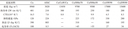 最常用的底板材料為Cu,為了降低CTE和保證高熱導(dǎo)率,金屬復(fù)合材料如AlSiC、W-Cu、Mo-Cu、以及Cu-Mo-Cu也得到廣泛應(yīng)用,其性能參數(shù)見表5[8]。底板一般會(huì)做鍍鎳處理,可以防止高溫下銅原子的遷移和氧化,提高銅底板的強(qiáng)度和變形抗力。