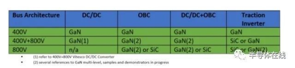 DC/DC轉(zhuǎn)換器和車載充電器通常采用GaN,而牽引逆變器通常采用SiC(盡管當(dāng)降低開關(guān)損耗變得重要時首選GaN)。主要是,對于中低電壓需求GaN能提供更好的效果,然而SiC主要用于高于1.2kV的高壓應(yīng)用。