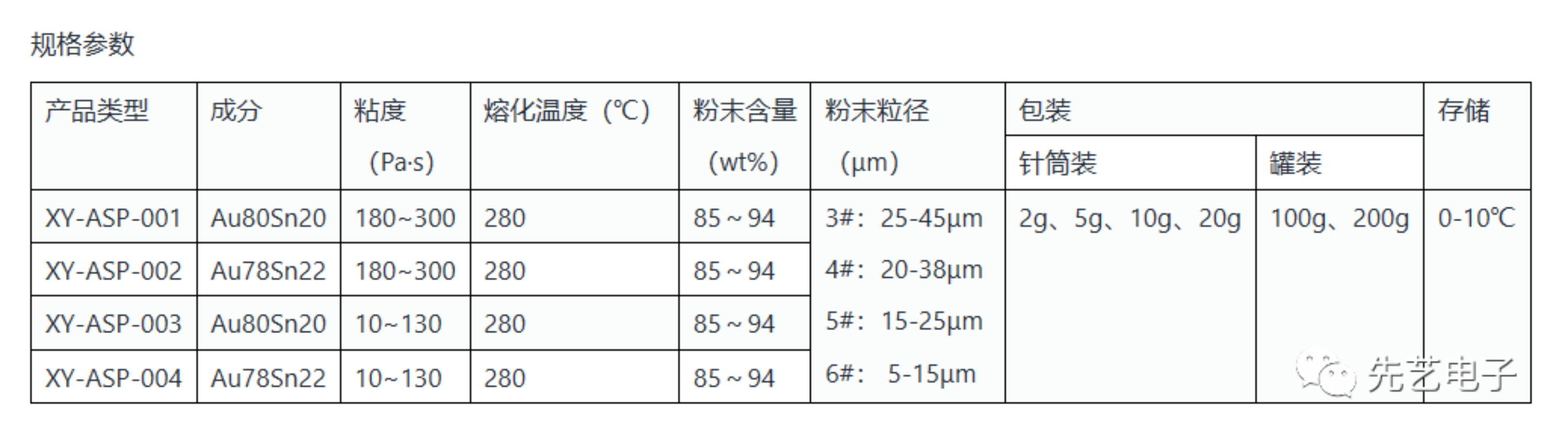 產(chǎn)品說明:金錫焊膏作為一種高可靠性高溫焊膏,服役溫度范圍較高的場合,具有熱疲勞性能好、在高溫下強度高、抗腐蝕與抗氧化性能優(yōu)異的特點。相較于金錫預成形焊片,在使用方式上更加靈活多樣,適用于微型光電器件的高可靠性封裝及大功率器件的高導熱封裝。