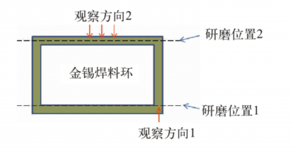 AuSn20焊料環(huán)本身的厚度只有50 u m,焊縫內(nèi)空洞的尺寸更小,一般在幾個(gè)微米的量級(jí)。一般采用X射線照相的方式,從宏觀上整體觀察焊料環(huán)區(qū)域,給出總體空洞率或單個(gè)空洞尺寸占焊縫設(shè)計(jì)寬度的百分比。此外,也可以采用超聲掃描的方法去探測(cè)密封區(qū)域的空洞。 若需要更為直觀地觀察空洞,則必須對(duì)樣品進(jìn)行破壞性物理分析。可以對(duì)待觀察樣品先鑲嵌成規(guī)則樣塊,然后用研磨機(jī)研磨,到達(dá)目標(biāo)區(qū)域后再剖光,然后進(jìn)行SEM觀察,為了增強(qiáng)觀察效果,還可以腐蝕、噴金等等。 圖3為樣品研磨位置和觀察截面的示意圖??梢越馄实窖心ノ恢?,從觀察方向1來(lái)觀察焊縫的端面,得到由焊料環(huán)內(nèi)部到外部的截面圖;也可以解剖到研磨位置2,從觀察方向2觀察焊縫的整個(gè)側(cè)面區(qū)域。