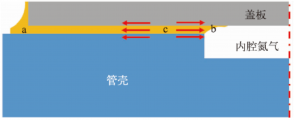 因?yàn)楹噶夏毯涂斩葱纬傻倪^(guò)程不易直觀觀察到,目前尚沒(méi)有人確切地指出環(huán)狀空洞的形成機(jī)理。很可能是由于焊料在降溫階段存在溫度梯度,環(huán)境溫度先于內(nèi)腔氮?dú)饨档偷焦财伏c(diǎn)以下,此時(shí)焊料a端先結(jié)晶凝固,如圖7所示。隨著溫度的繼續(xù)降低,內(nèi)腔氮?dú)鈮簭?qiáng)逐步下降,焊料與蓋板之間的潤(rùn)濕平衡被打破,對(duì)焊料b端產(chǎn)生進(jìn)一步向內(nèi)的趨勢(shì),直至溫度也達(dá)到共晶點(diǎn).在爭(zhēng)奪當(dāng)中 ,空洞在c處長(zhǎng)大。同時(shí),焊料環(huán)寬度與焊縫寬度差距較大,導(dǎo)致密封過(guò)程中焊料量不足,難以鋪滿密封區(qū),這也是形成空洞的原因。