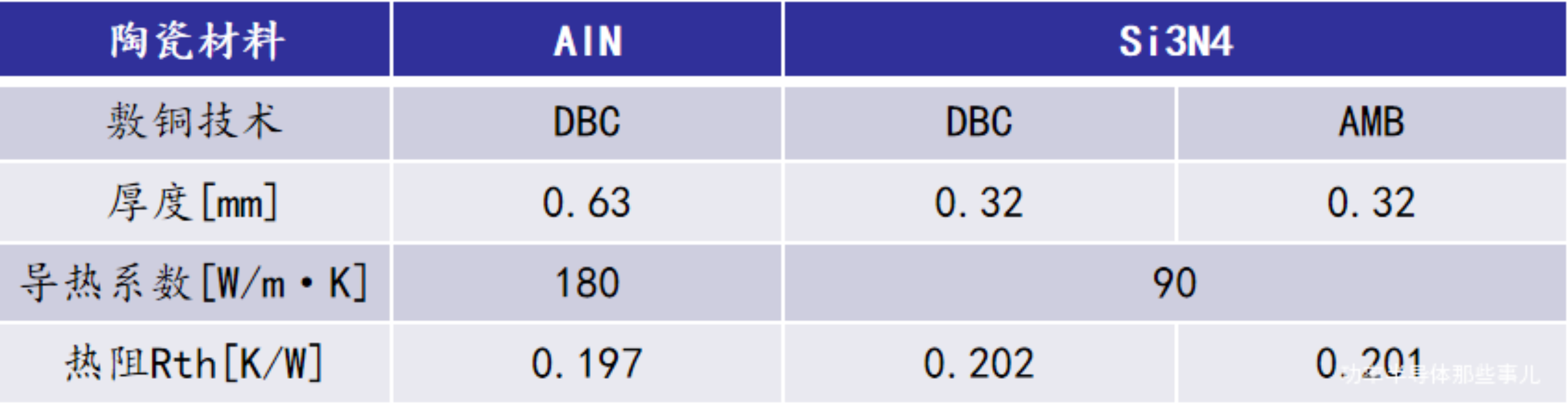 銅金屬化基板的熱阻主要取決于陶瓷基本材料,下表是AlN和Si3N4基板搭配0.3mm的銅層后的熱阻對(duì)比,由于熱阻Rth和厚度成正比,所以氮化硅厚度是氮化鋁一半時(shí),熱阻幾乎一致。
