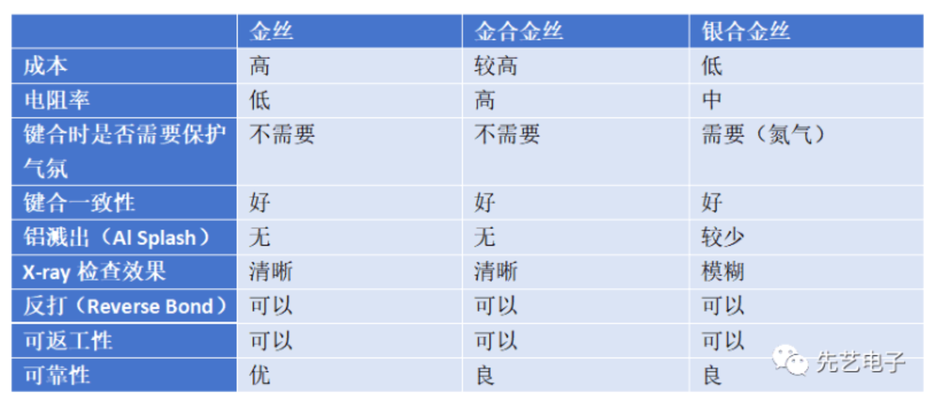 引線(xiàn)鍵合所用到的金屬絲即為鍵合絲,鍵合絲是微電子封裝中重要的互連材料。由于金具有良好的抗腐蝕性、抗氧化性和優(yōu)良的延展性、導(dǎo)電性,因此是目前電子工業(yè)中最普遍采用的引線(xiàn)材料。而鑒于純金高昂的價(jià)格,材料成本更具優(yōu)勢(shì)的金合金絲、銀合金絲也正得到更廣泛地應(yīng)用。三種貴金屬鍵合絲的特點(diǎn)如下表所示: