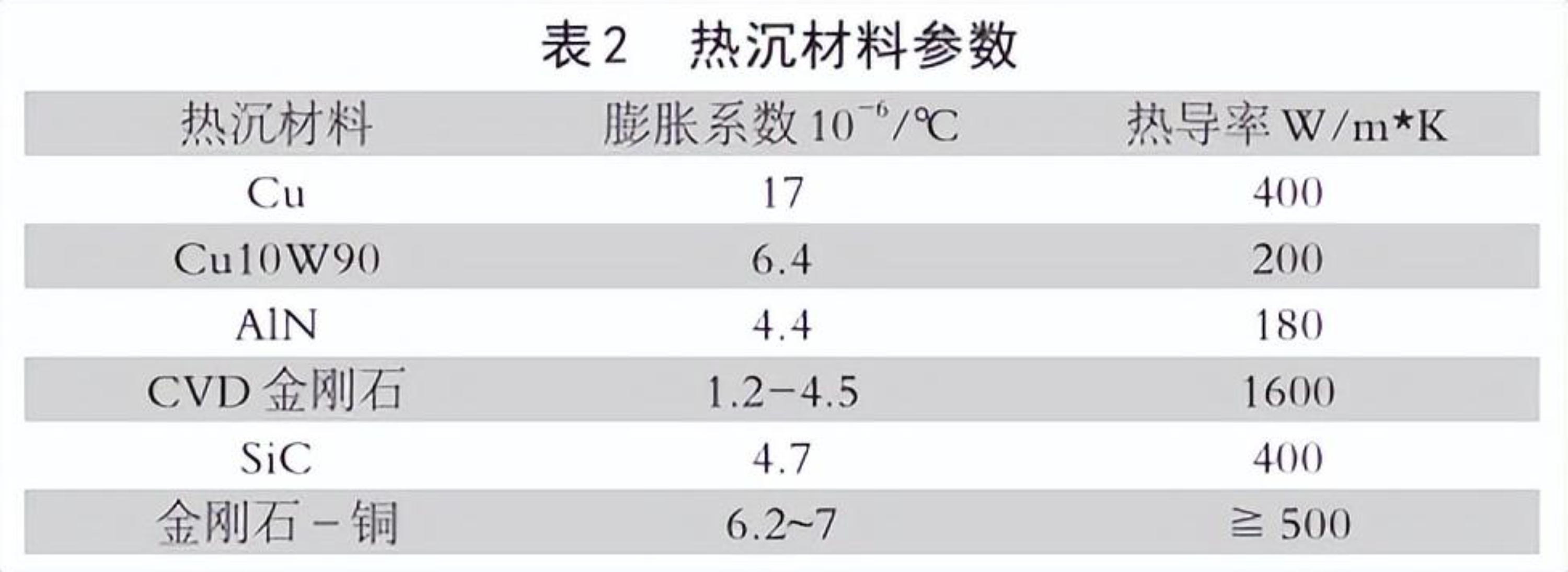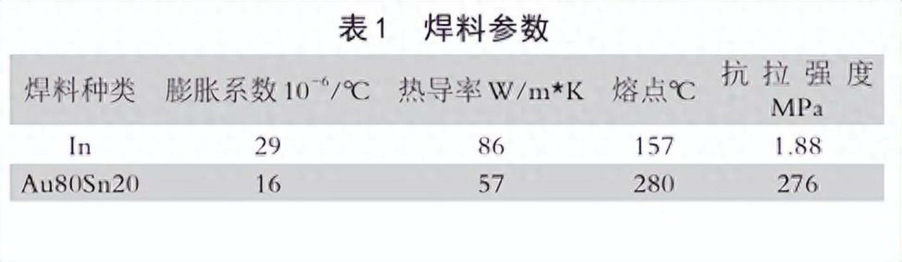 Au80Sn20較銦焊料最大特點是硬度較高,焊料抗拉強度276MPa,不容易緩沖燒結(jié)時產(chǎn)生的應(yīng)力,所以器件封裝需要考慮熱膨脹系數(shù)匹配關(guān)系。表1為可用于半導(dǎo)體激光器封裝的常用熱沉材料的參數(shù)表。