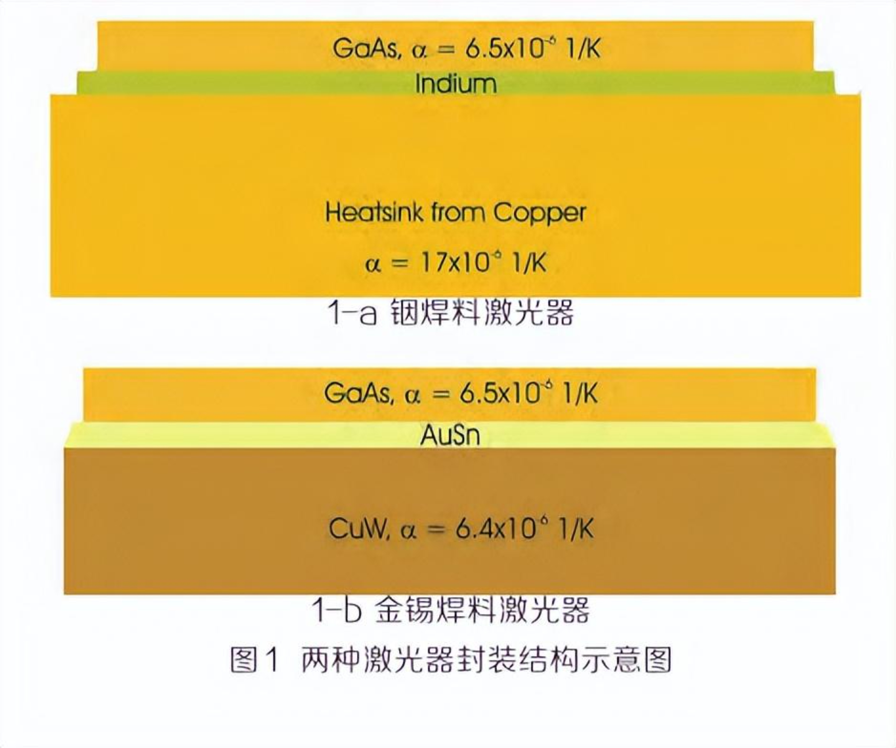 芯片是GaAs材料,其熱膨脹系數(shù)為6.5*10 -6 /℃。表2中Cu10W90材料熱膨脹系數(shù)與GaAs相近。我們選用鎢銅材料做金錫焊料器件的熱沉,減少封裝應(yīng)力。銦焊料封裝激光器選用銅熱沉,銅熱沉熱導(dǎo)率高,雖然熱膨脹系數(shù)與GaAs熱膨脹系數(shù)相差較大,但銦焊料較軟可以很好的緩沖應(yīng)力。