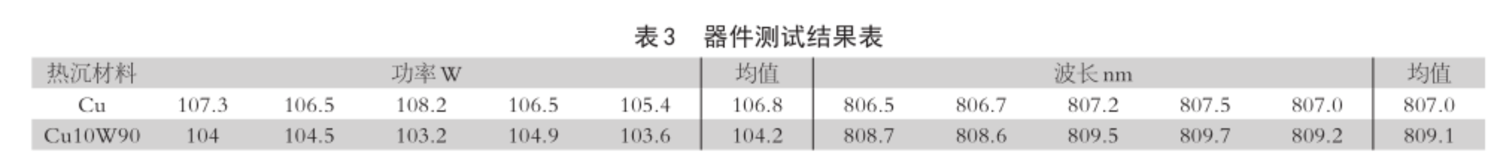 封裝完成的器件進行進行測試輸出功率,連續(xù)電流110A,冷卻水溫度25℃,測試結(jié)果見表3,從中可以看出銅熱沉器件平均功率比鎢銅熱沉器件高2.6W,平均波長短2.1nm。這是由于兩種材料熱沉熱阻不同引起的。上述兩種熱沉的熱阻分別為0.24K/W、0.31 K/W,按照100W熱量計算芯片結(jié)溫相差7℃。測試兩種器件波長相差2.1nm,按照波長溫漂系數(shù)0.26nm/℃,兩者結(jié)溫相差7.7℃,與理論值相符。