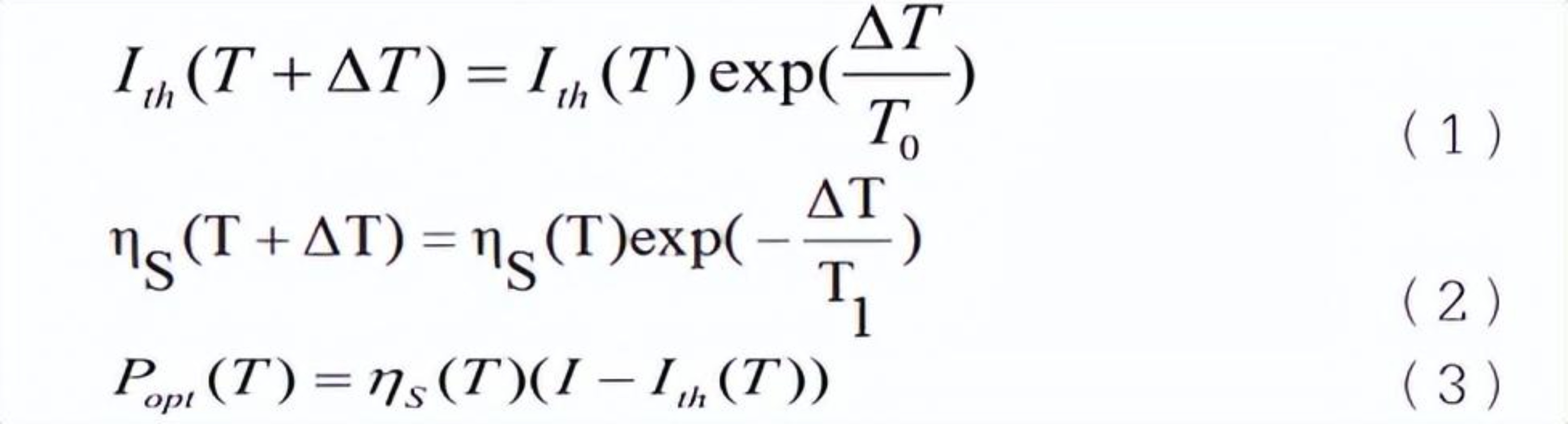 代入T 0 =150K,I th =21A,T1=321K,T2=329K代入得到了兩溫度下功率之差為3.1W與測試數(shù)值2.6W相符。說明兩種器件功率之差是由芯片結(jié)溫引起的。