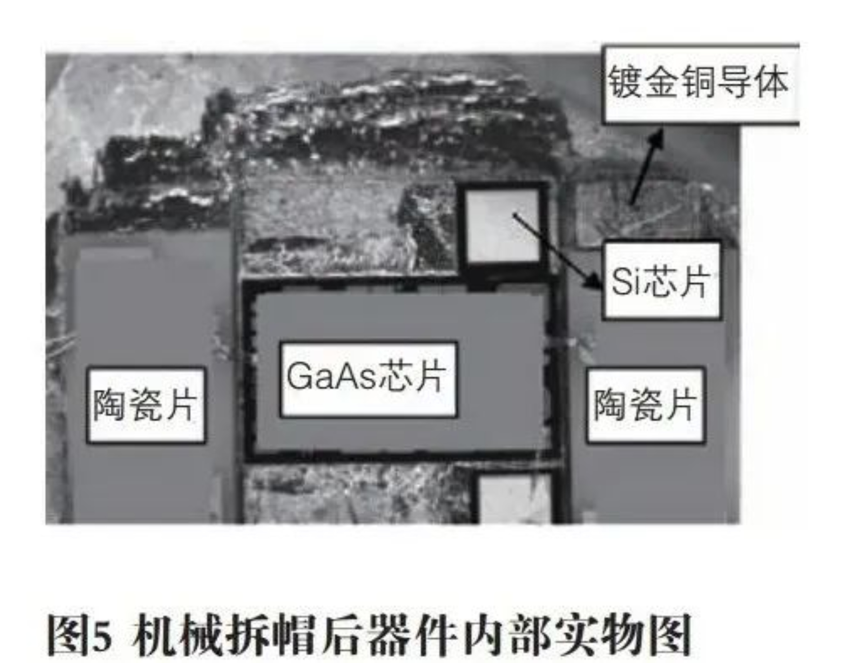 4.3 性能測試對40只樣品進(jìn)行了封帽前后性能測試對比,其駐波及增益的變化率均與平行封焊的變化率一致,說明采用倒置型裝配的金錫封帽工藝對產(chǎn)品的性能沒有影響。4.4 內(nèi)部目檢抽取5只產(chǎn)品機械開帽后,未發(fā)現(xiàn)一例金錫焊料重新熔化的現(xiàn)象,其金錫焊料仍保持芯片焊接后的形態(tài),所有載體、GaAs芯片、Si芯片、陶瓷電路片和鍍金銅導(dǎo)體均未出現(xiàn)偏移浮起現(xiàn)象,說明經(jīng)焊后的金錫焊料的熔化溫度大于封焊峰值溫度。