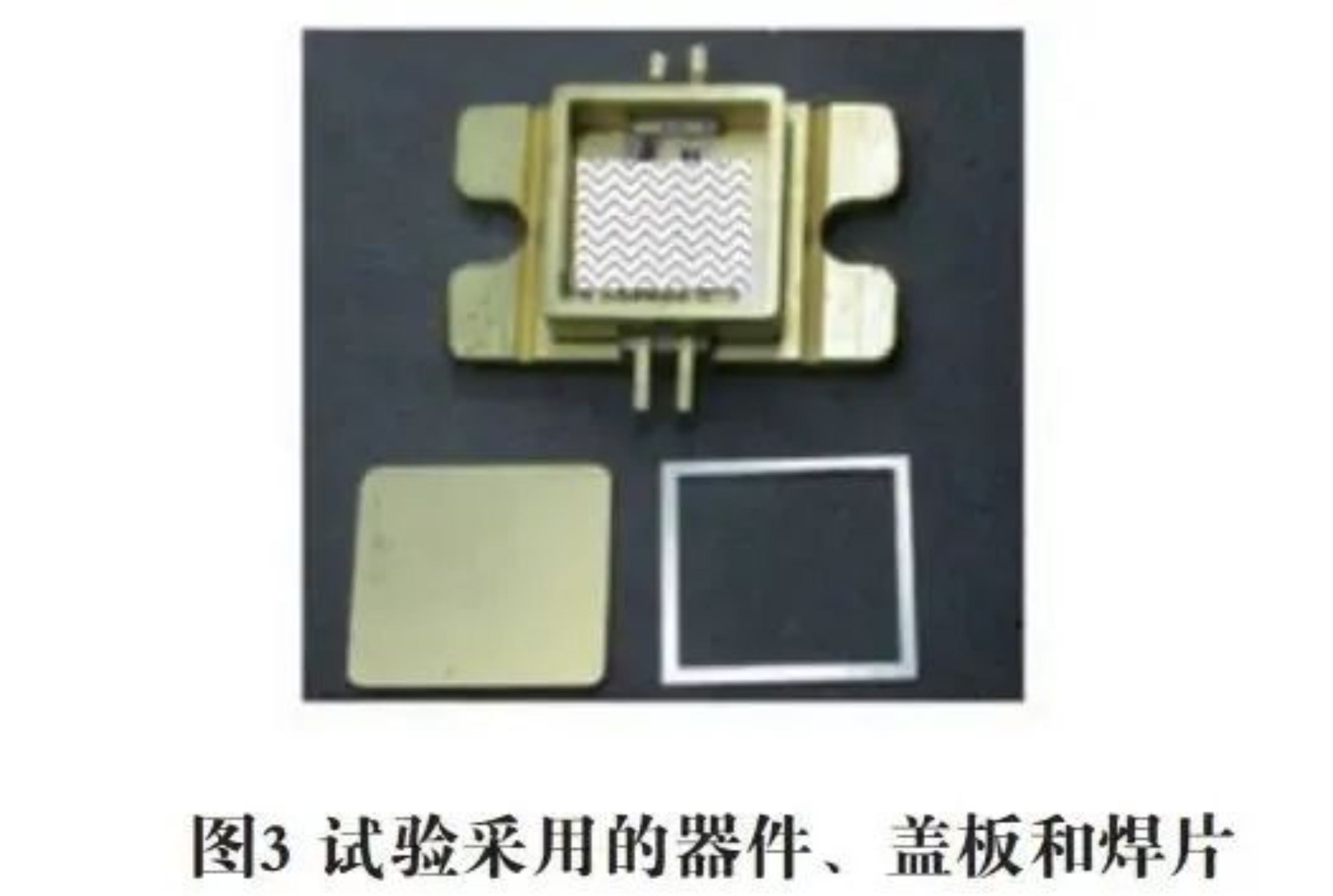 試驗采用的器件殼體為可伐4J29,管口尺寸為11.4 mm×10.7 mm;蓋板同樣選用可伐4J29,尺寸為11.3 mm×10.6 mm×0.3 mm;Au80Sn20預(yù)成型焊片的選用與殼體及蓋板的平整度是相互關(guān)聯(lián)的,若殼體與蓋板的金屬表面很平整,焊料不需要很厚就能完全潤濕,但當(dāng)殼體與蓋板之間存在縫隙時,就需要采用較厚的焊片才能實現(xiàn)氣密性封裝,通過反復(fù)測量及多次試驗,最終選取了尺寸為11.300mm×10.600 mm×0.053 mm的合金焊片。