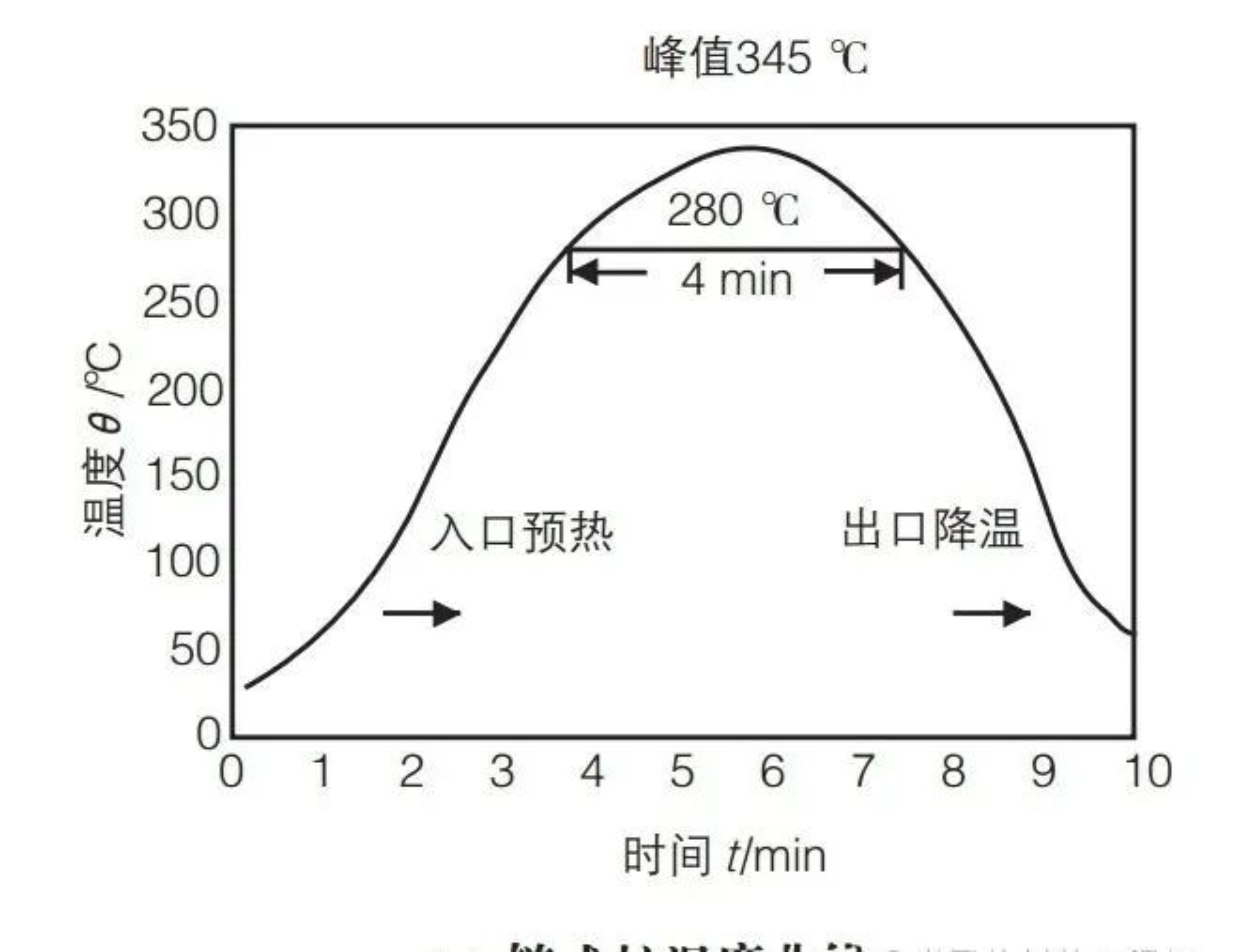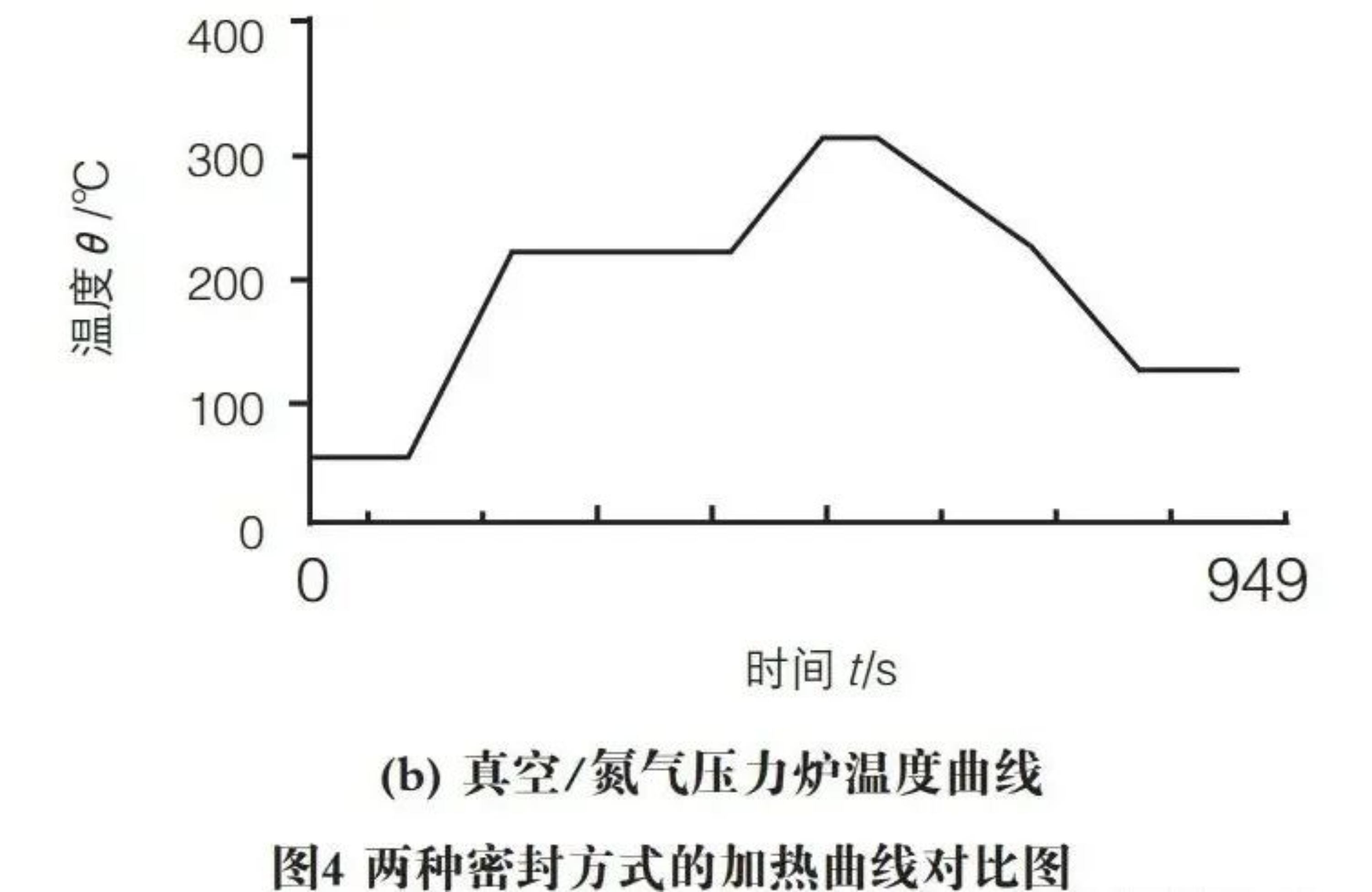 將器件、蓋板和焊片分別在甲苯、丙酮和乙醇中超聲清洗5 min,取出后用氮氣吹干,以去除殼體表面污染。將蓋板、焊片和器件依次放入定位夾具內(nèi),壓入壓針,放入真空爐內(nèi),經(jīng)過抽真空、加熱(加熱曲線如圖4所示)、加壓和降溫過程,完成整個密封過程。鏈?zhǔn)綘t密封的典型加熱周期包括快速預(yù)熱期(3 min~5 min),液相溫度以上的最短時間(3 min~5 min),高于熔融溫度40 ℃~80 ℃的峰值溫度,以及固化后的快速冷卻。這種加熱方式首先較難保證內(nèi)部水汽含量,前期需要真空烘烤;其次其加熱及冷卻速率很難控制,易對內(nèi)部芯片造成熱沖擊。在真空爐內(nèi)進(jìn)行密封不僅能夠準(zhǔn)確地控制加熱曲線,而且可以在預(yù)熱區(qū)就能進(jìn)行真空烘烤,以保證內(nèi)部氣氛含量。