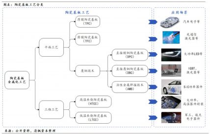 按制造工藝分類:陶瓷基板主要分為平面陶瓷基板和三維陶瓷基板兩大類。主要的平面陶瓷基板工藝可分為薄膜陶瓷基板(TFC)、厚膜印刷陶瓷基板(TPC)、直接鍵合銅陶瓷基板(DBC)、活性金屬焊接陶瓷基板(AMB)、直接電鍍銅陶瓷基板(DPC)。主要的三維陶瓷基板分為高溫共燒陶瓷基板(HTCC)和低溫共燒陶瓷基板(LTCC)。