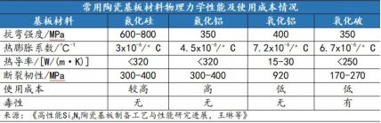 陶瓷粉體是影響陶瓷基板物理、力學(xué)性能的關(guān)鍵因素。粉體的純度、粒度、物相、氧含量等會(huì)對陶瓷基板的熱導(dǎo)率、力學(xué)性能產(chǎn)生重要影響,其特性也決定了基板成型工藝、燒結(jié)工藝的選擇。BeO陶瓷具有較高的熱導(dǎo)率,但是其毒性和高生產(chǎn)成本限制了它的生產(chǎn)和應(yīng)用。Al2O3陶瓷基板因其價(jià)格低廉、耐熱沖擊性好已被廣泛應(yīng)用,但因其熱導(dǎo)率相對較低和熱膨脹率不匹配的問題,已無法完全滿足功率器件向大功率、小型化方向發(fā)展的趨勢。AlN和Si3N4陶瓷基板在膨脹系數(shù)及熱導(dǎo)率方面的優(yōu)勢被認(rèn)為是未來的發(fā)展方向。Si3N4的撓曲強(qiáng)度更是得到大幅改善, 設(shè)計(jì)師們也因此而受益;其斷裂韌性甚至超過了氧化鋯摻雜陶瓷,在 90 W/mK 的熱導(dǎo)率下達(dá)到了6.5~7 MPa/√m。