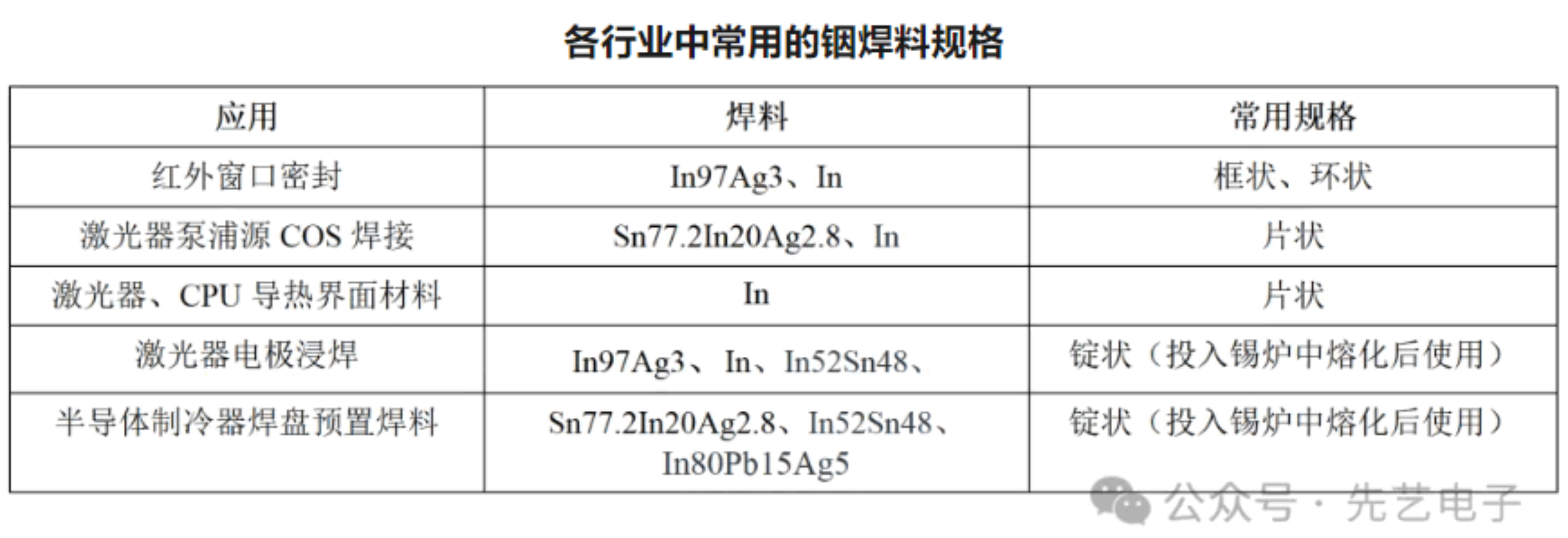 金屬銦具有延展性好、可塑性強(qiáng)、熔點(diǎn)低、蒸氣壓低、低電阻、抗腐蝕等優(yōu)良特性,含銦焊料良好的導(dǎo)熱導(dǎo)電性能及較低的熔化溫度使之在眾多場(chǎng)合被廣泛應(yīng)用,其中典型的焊料品種包括純銦、銦銀合金、銦鉛合金等。銦焊料多被加工成預(yù)成形焊片使用,常見(jiàn)的形狀為框狀或方片狀。