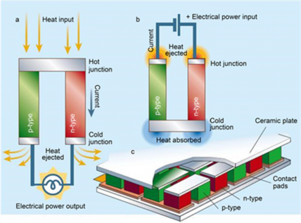 半導(dǎo)體熱電技術(shù)主要包括半導(dǎo)體熱電制冷技術(shù)和溫差發(fā)電技術(shù)兩個(gè)應(yīng)用方向,分別利用半導(dǎo)體材料的帕爾貼效應(yīng)(Peltier effect)和塞貝克效應(yīng)(Seebeck effect),實(shí)現(xiàn)了電能和熱能之間的相互轉(zhuǎn)換,是一種環(huán)保型制冷技術(shù)和綠色能源技術(shù)。