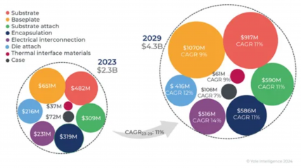 功率模塊封裝材料的成本取決于封裝材料,如管芯連接、陶瓷基板材料和封裝尺寸。2023年,功率模塊封裝材料成本約為23億美元,約占功率模塊總成本的30%。Yole Group 旗下Yole Intelligence的《2024年功率模塊封裝行業(yè)現(xiàn)狀》報(bào)告指出,xEV正在推動(dòng)功率模塊封裝材料市場(chǎng)的發(fā)展,預(yù)計(jì)到2029年,功率模塊封裝材料的市場(chǎng)規(guī)模將從2023年的23億美元翻倍增長(zhǎng)至43億美元,復(fù)合年均增長(zhǎng)率為11%。
