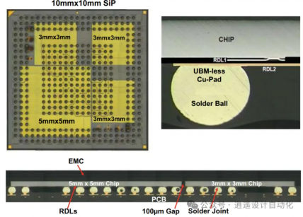 這種技術(shù)用扇出RDL中間層替代了TSV中間層、微凸點(diǎn)和底填。與傳統(tǒng)的2D扇出技術(shù)相比,它提供了改進(jìn)的性能和集成密度。