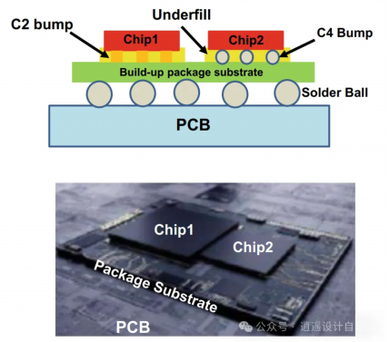 在這種技術(shù)中,芯片被翻轉(zhuǎn)并使用C4(受控塌陷芯片連接)凸點(diǎn)或C2(芯片連接)凸點(diǎn)附著到構(gòu)建封裝基板上。通常在芯片和封裝基板之間使用底填以提高可靠性。